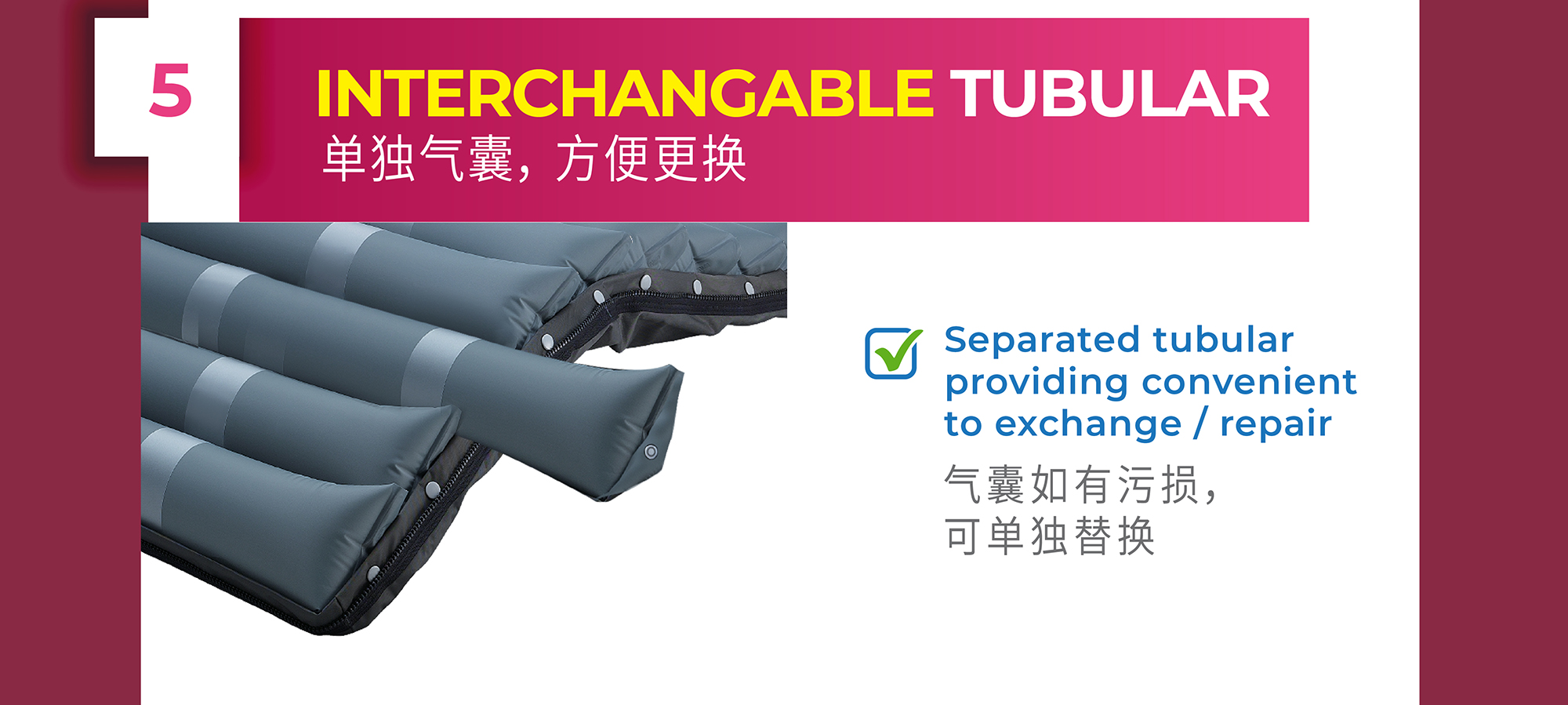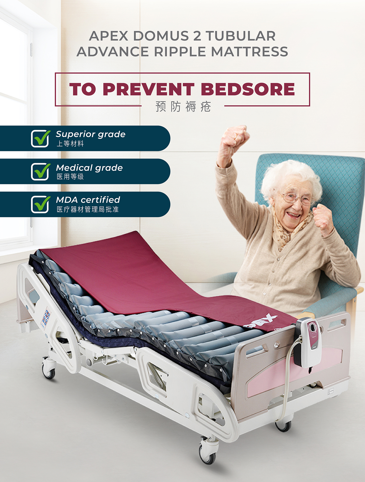 Apex Domus 2 Tubular Ripple Mattress is designed for prevention and treatment of pressure ulcer. Thus, it is suitable for bedridden patients at low to medium risk of pressure ulcer.