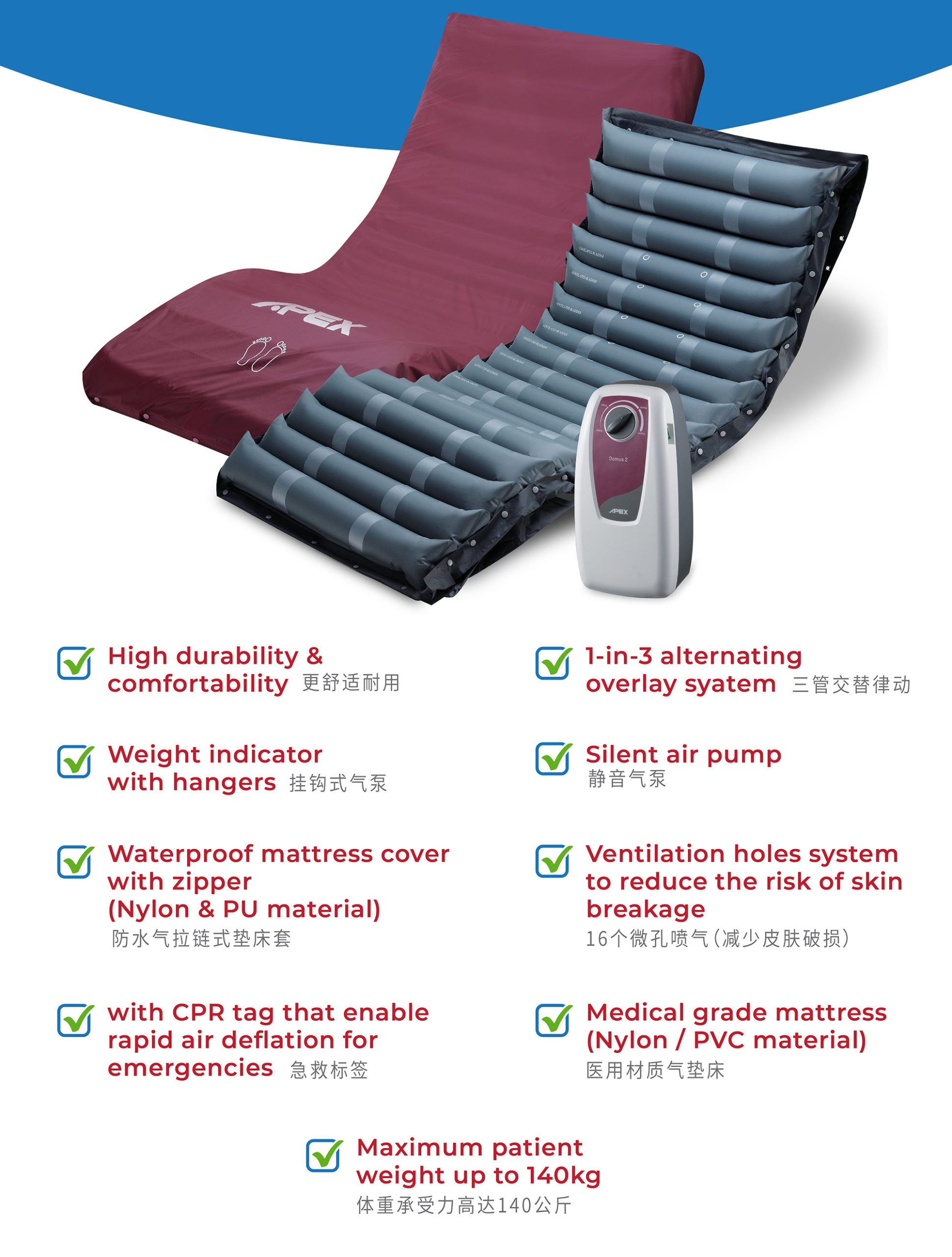 Apex Domus 2 Tubular Ripple Mattress is designed for prevention and treatment of pressure ulcer. Thus, it is suitable for patients at low to medium risk of pressure ulcer.