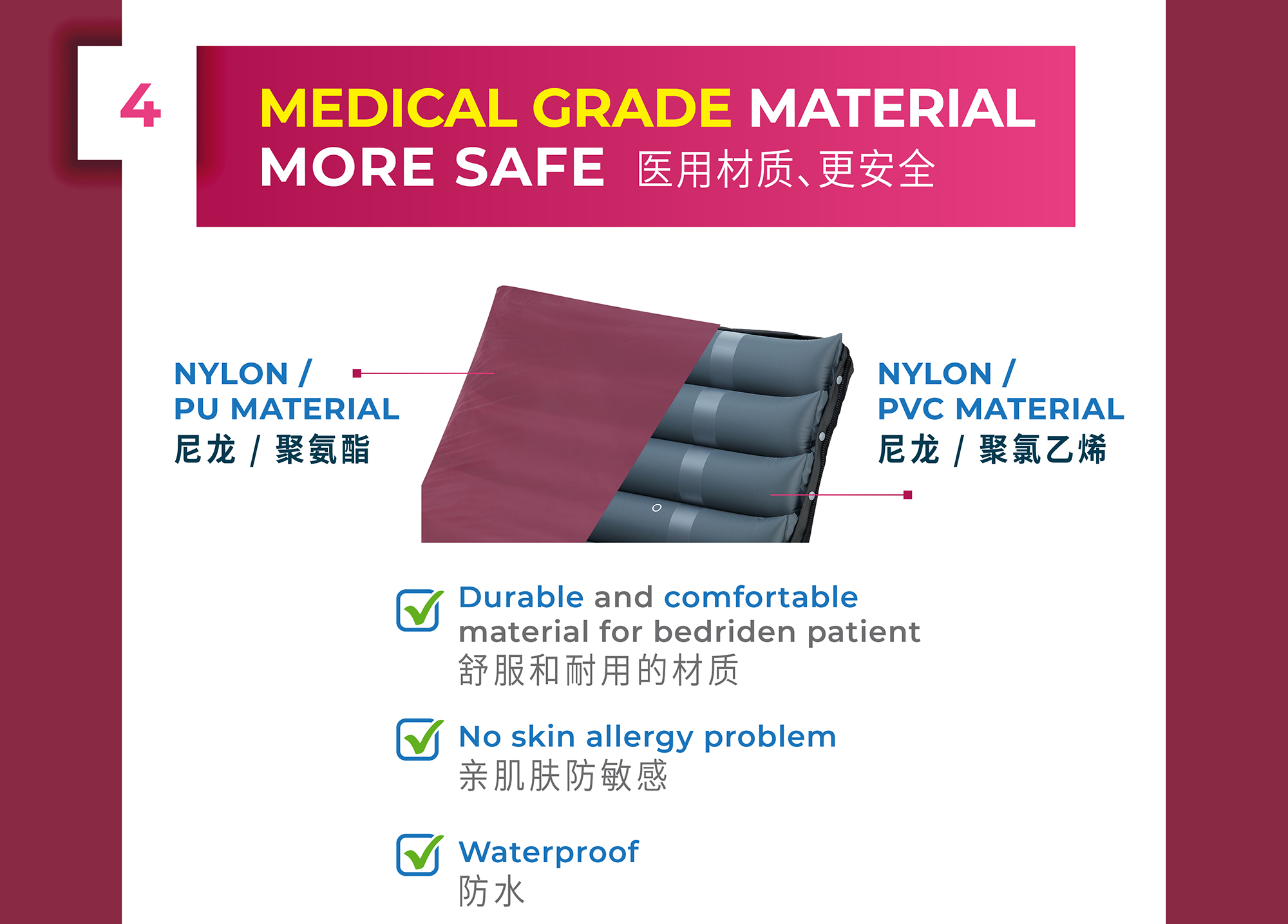 - Low air loss function to create good air ventilation flow to reduce the risk of skin breakage