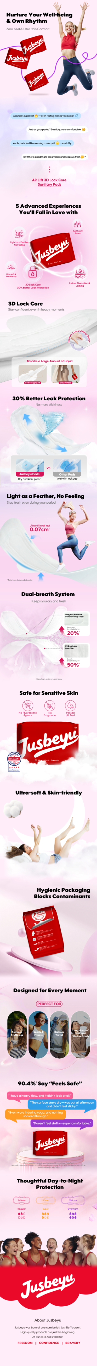 Worried about leaks, discomfort, or that heavy, stuffy feeling during your period? Jusbeyu Sanitary Pad is thoughtfully designed to support you through your flow days with reliable protection and cloud-soft comfort. Featuring a wider 3D Lock Core and advanced absorption technology, it helps manage menstrual flow efficiently while keeping the surface dry. Its ultra-thin, zero-touch feel allows you to move freely and confidently—so you can focus on your day, not your pad ✨