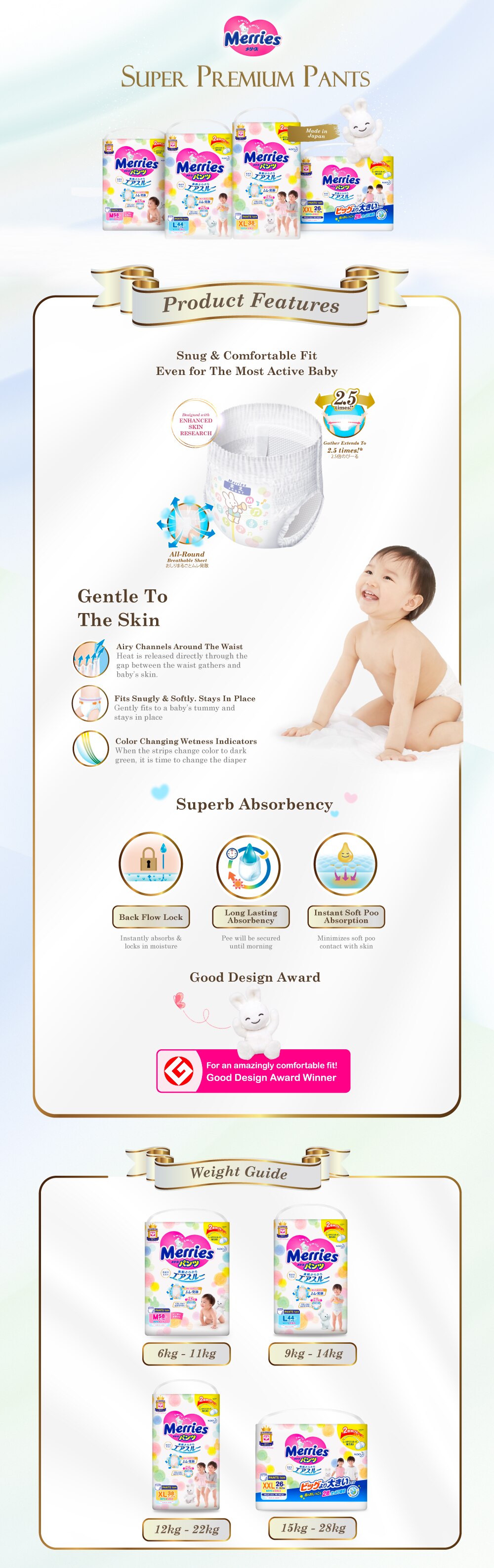Merries' unique block shaped absorbent core instantly draws in and locks away pee, leaving the diaper surface drier for longer usage.