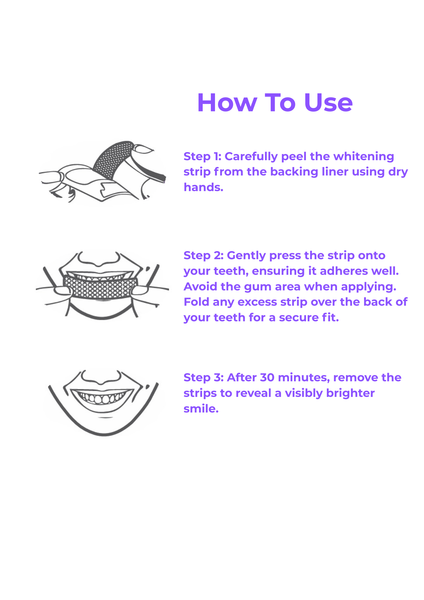 Step 2: Apply. Gently press the strip onto your teeth, ensuring it adheres well. Avoid the gum area when applying. Fold any excess strip over the back of your teeth for a secure fit.